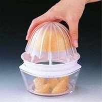 Makes perfect fruit slices every time! A product that peels, slices, and makes juice perfectly! Cut the fruit in two, and to remove the fruits core, plunge the citrus corer into the center of the fruit while turning. Firmly press a fruit-half on the wedge cutter. Place the cover on the wedge cutter and turn it one full turn, and you have beautiful fruit segments, ready to serve!